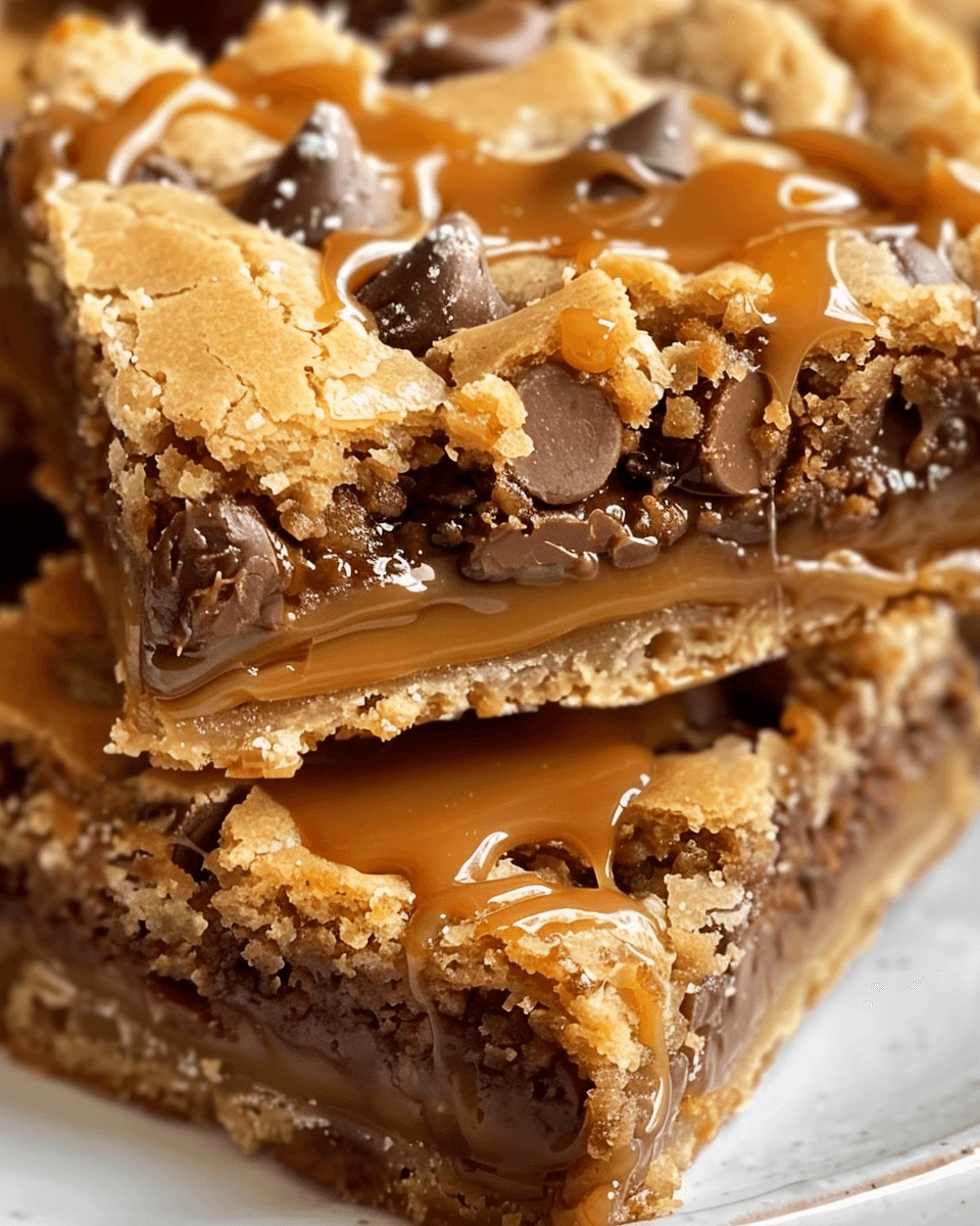 A decadent bar dessert with a rich chocolate chip cookie base, a gooey salted-caramel center, and a soft cookie top sprinkled with sea salt—a perfect sweet & salty treat.